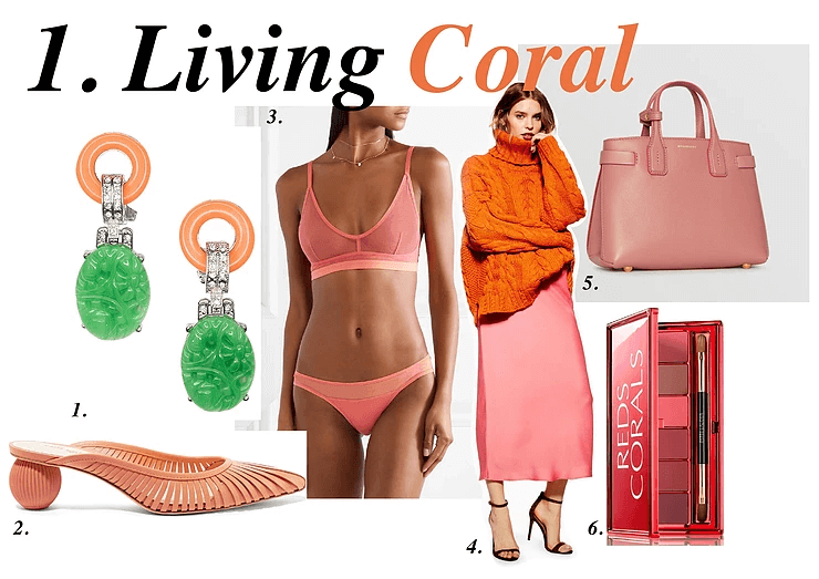 1. Coral and jade art deco earrings, Kenneth Jay Lane, £108.10 / 2. Alia mules, Cult Gaia, £295 / 3. Ophelia soft cup bra, Skin, £26 / 4. Satin bias midi skirt, Topshop, £29.00 / 5. Small Banner bag, Burberry, £1050 / 6. Red corals lip palette, Estee Lauder, £34.00